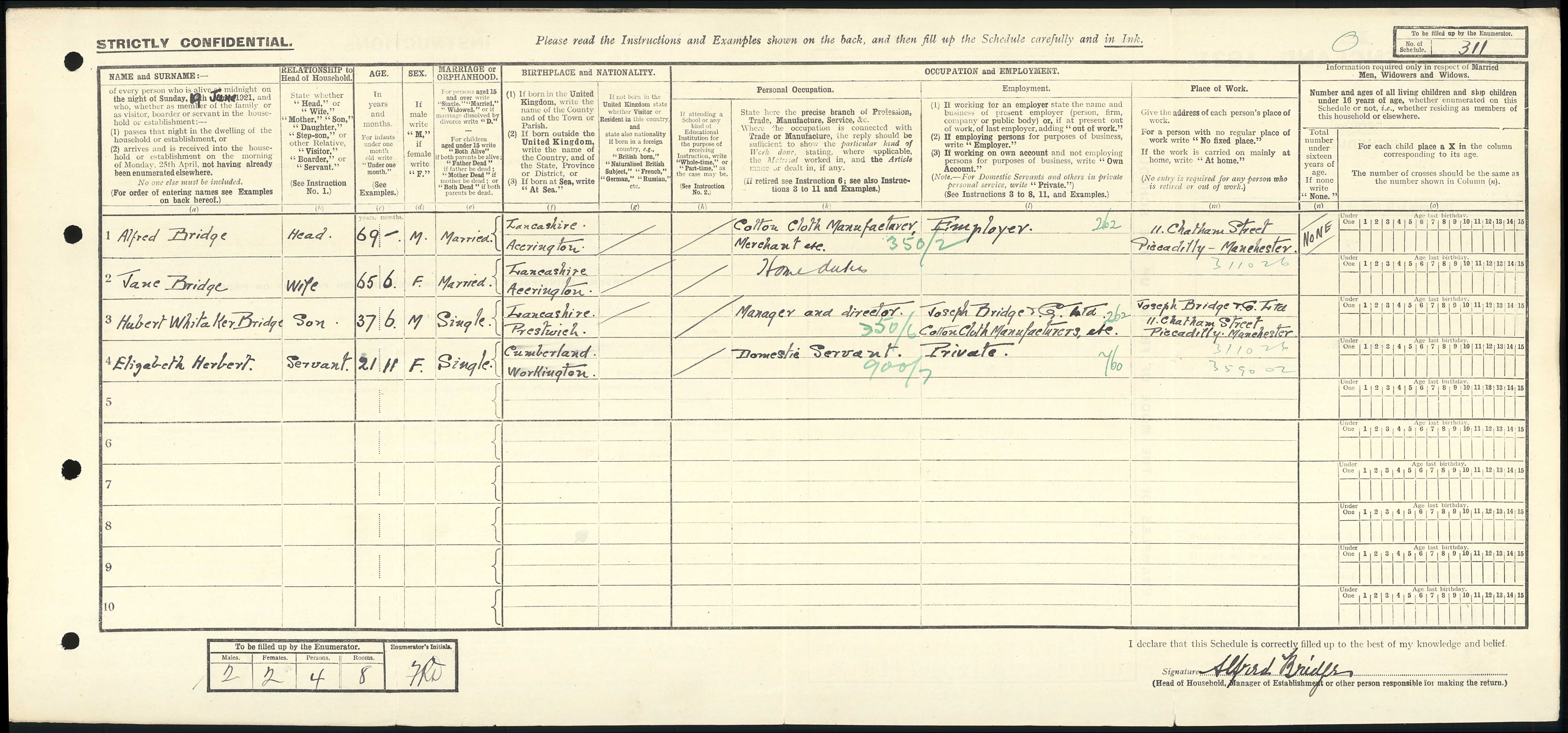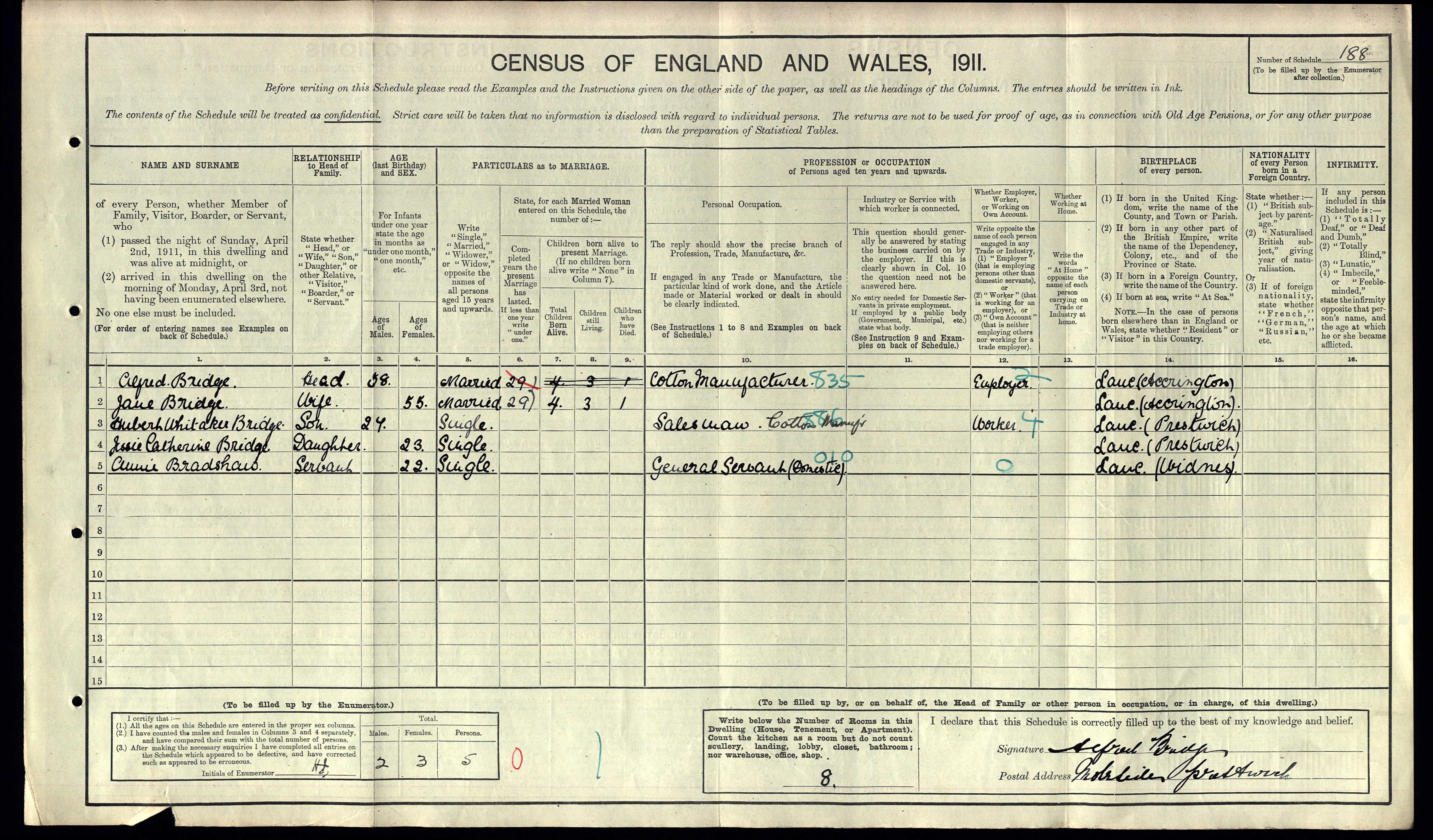 In 1891 Hubert Bridge was 7 and living at 3 Devonshire place, Prestwich with his parents Alfred and Jane and twin younger sisters Florence & Issie aged 5, and domestic servant Ellen Howett aged 24.