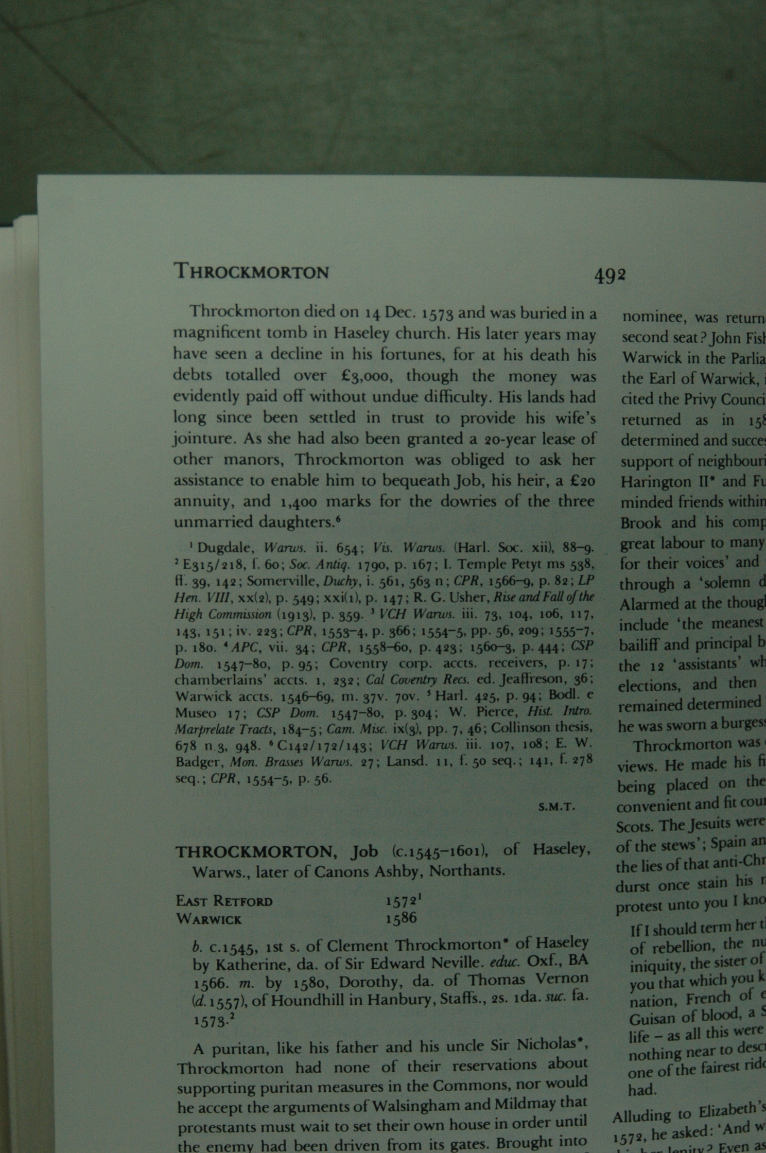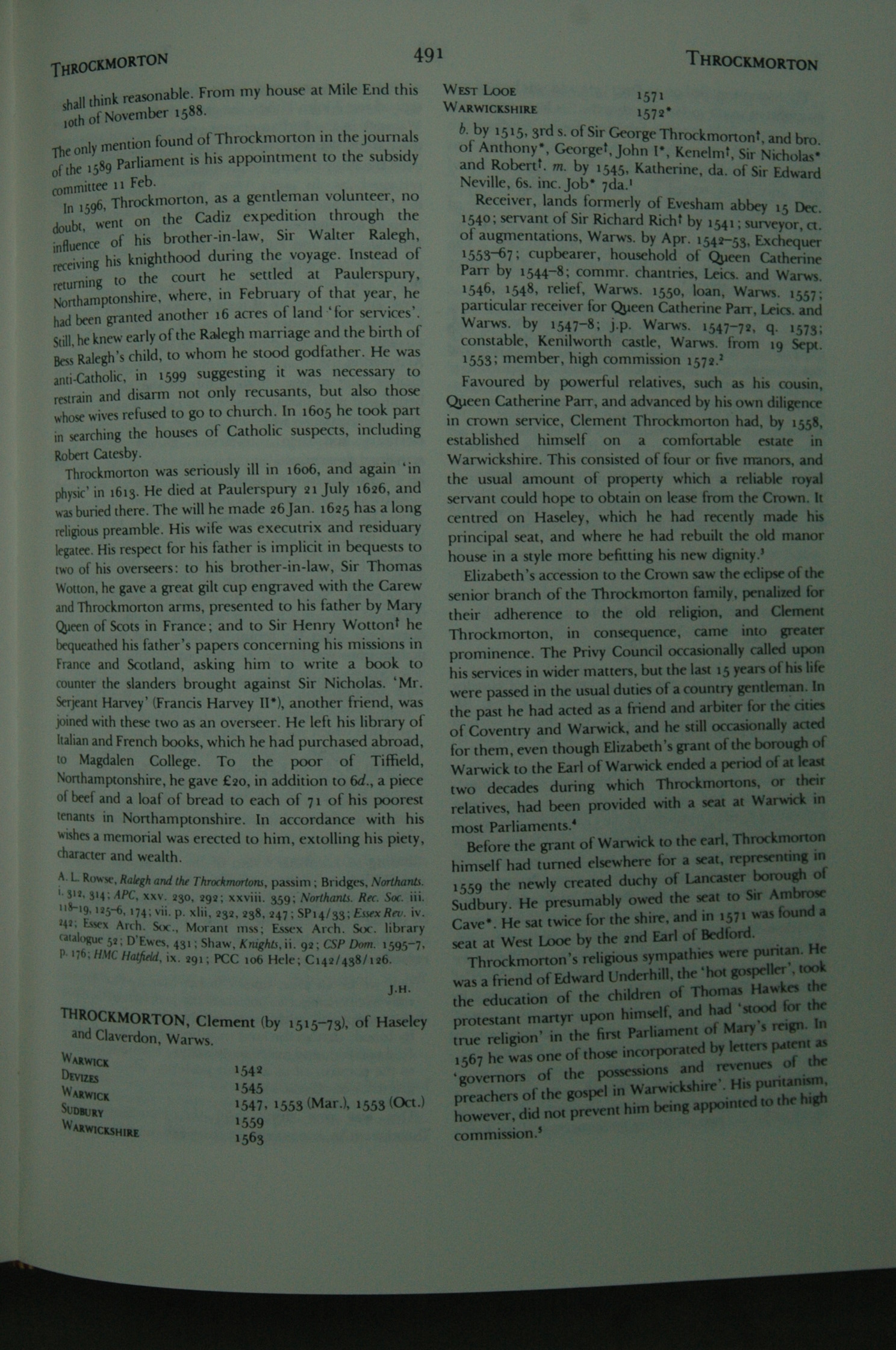 Throckmorton's election to the last but one of Henry VIII's Parliaments he doubtless owed to his father, perhaps assisted by his master Rich; the town of Warwick was amendable to Sir George Throckmorton's influence and a number of Rich's dependants were returned on this occasion almost certainly to smooth passage of measures relating to the royal estates. Throckmorton was to sit for Warwick again, but in the next Parliament is was his brother Kenelm who was elected there while he transferred to Devizes, which formed part of Catherine Parr's jointure as Queen. In the first Parliament of the new reign another brother, Sir Nicholas, sat for Devizes and Clement returned to Warwick; he was to be re-elected there to the two following Parliaments, in Mar 1553 with his brother John. That this sequence of elections was broken in 1554 is probably to be attributed to Throckmorton's Protestant leanings- in Mary's 1st Parliament he was one of those who 'stood for the true religion'- and to the implication of his brother Nicholas and kinsmen John Throckmorton in plots against the government, although the family's hold on Warwick was strong enough for two other brothers, George and Kenelm, to be elected there in turn. Throckmorton himself remained loyal to Mary: in Feb 1554 he helped to arrest the fugitive Duke of Suffolk and then rode to court to announce the capture to the Queen.