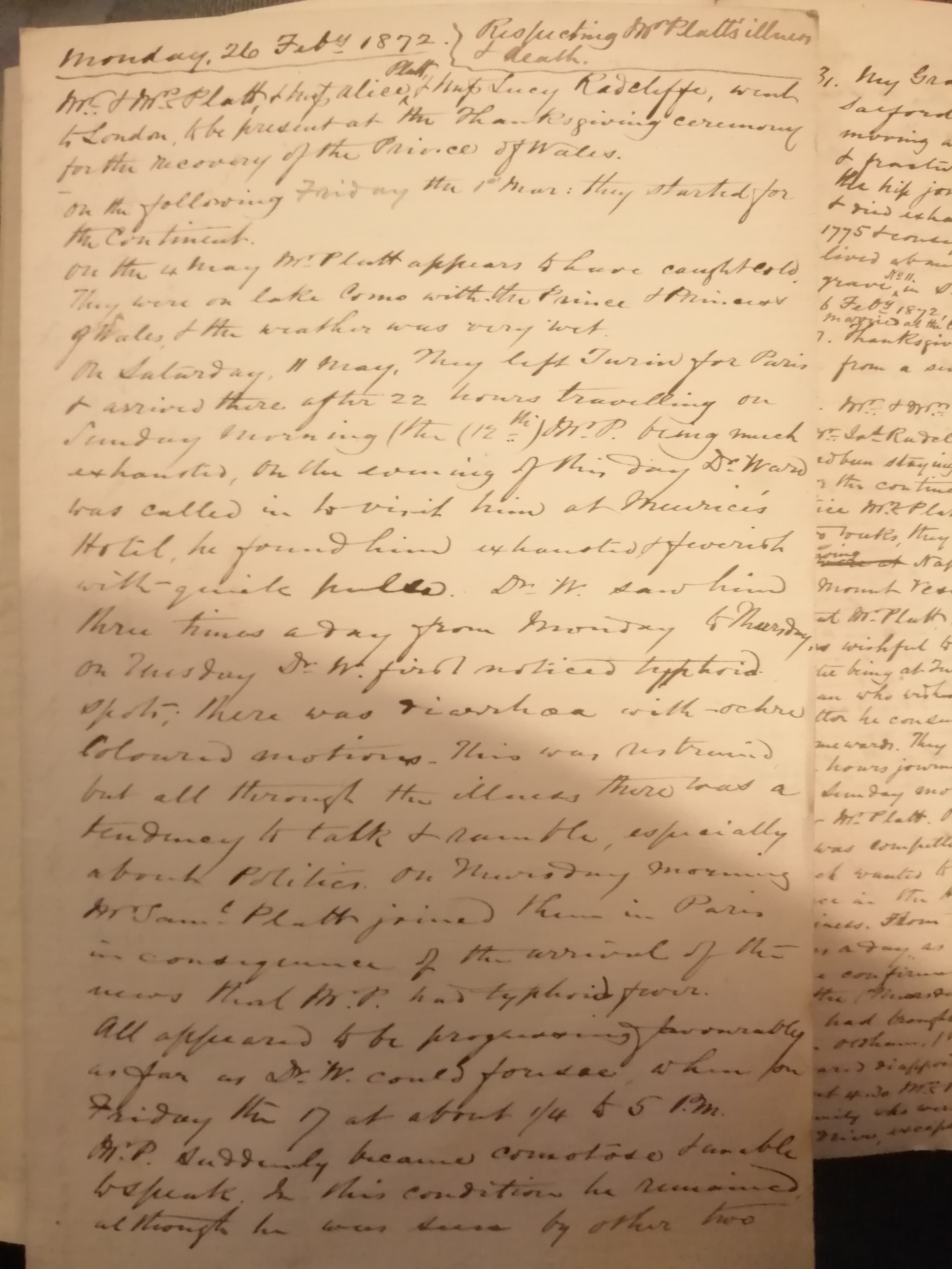 The will of John platt late of Werneth Park, Oldham in the county of Lancaster and of Bryn-y-neuadd in the county of Caernarvon, Esquire who died 18 May 1872 at the "Hotel Meurice" Rue Rivoli in the city of Paris was proved at Manchester by Henry Platt of Gorddinog in the parish of Aber in the county of Caernarvonshire Esquire, Samuel Radcliffe Platt of Werneth Park Machine Maker, Frederick Platt of Werneth Park Machine Maker the sons, Thomas Hardcastle Sykes of Cringle House, Cheadle in the County of Chester, Bleacher, and Joshua Walmsley Radcliffe of Holly Lea near Rochdale in the county of Lancaster, Woolen Manufacturer, the Executors.