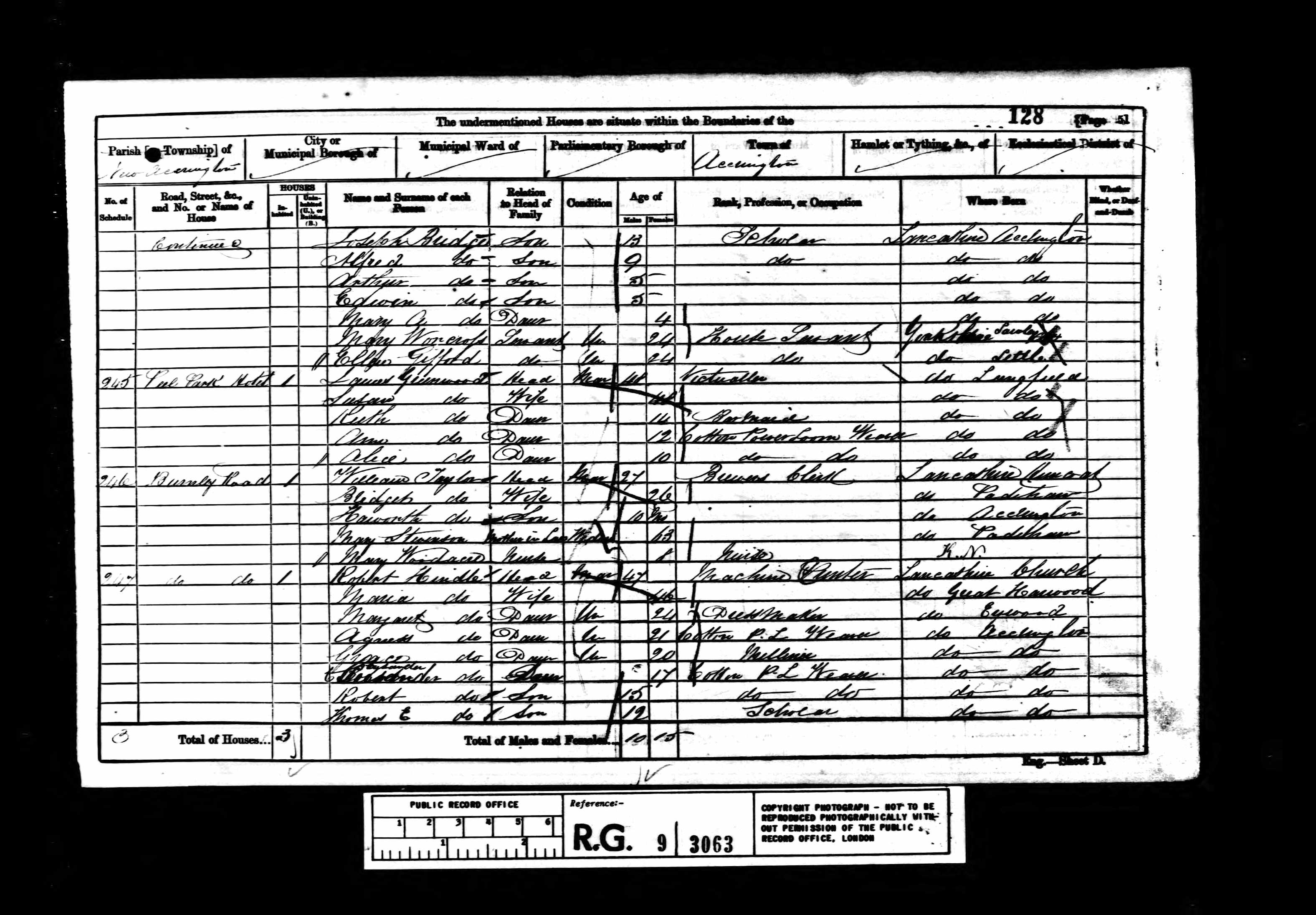 Accrington House, LAN New Accrington, aged 53 years (born in LAN Accrington) [C7:RG10/4143/132/25]; cloth salesman & dealer, of 11 Polygon, Broughton , LAN Salford