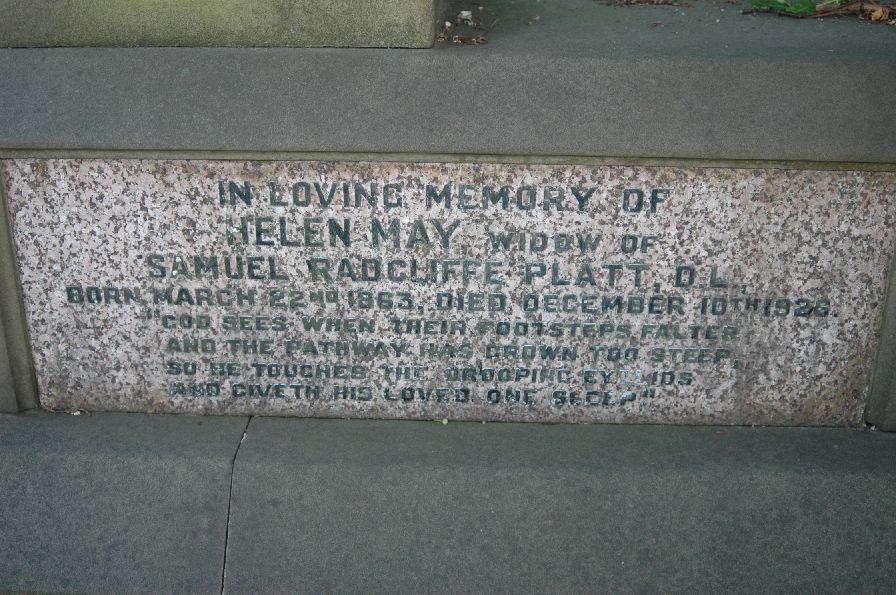 Platt, Helen Mary of New-place, Sunningdale, Berkshire, widow, died 10 December 1926 at The Grange, Chislehurst, Kent. Probate London 26 February to Evelyn Alice Jane Radcliffe widow, Alice May Brownlow (wife of the honourable Francis Cecil Brownlow) and Nancy Quinelda Platt spinster. Effects £178725 15s. 2d.