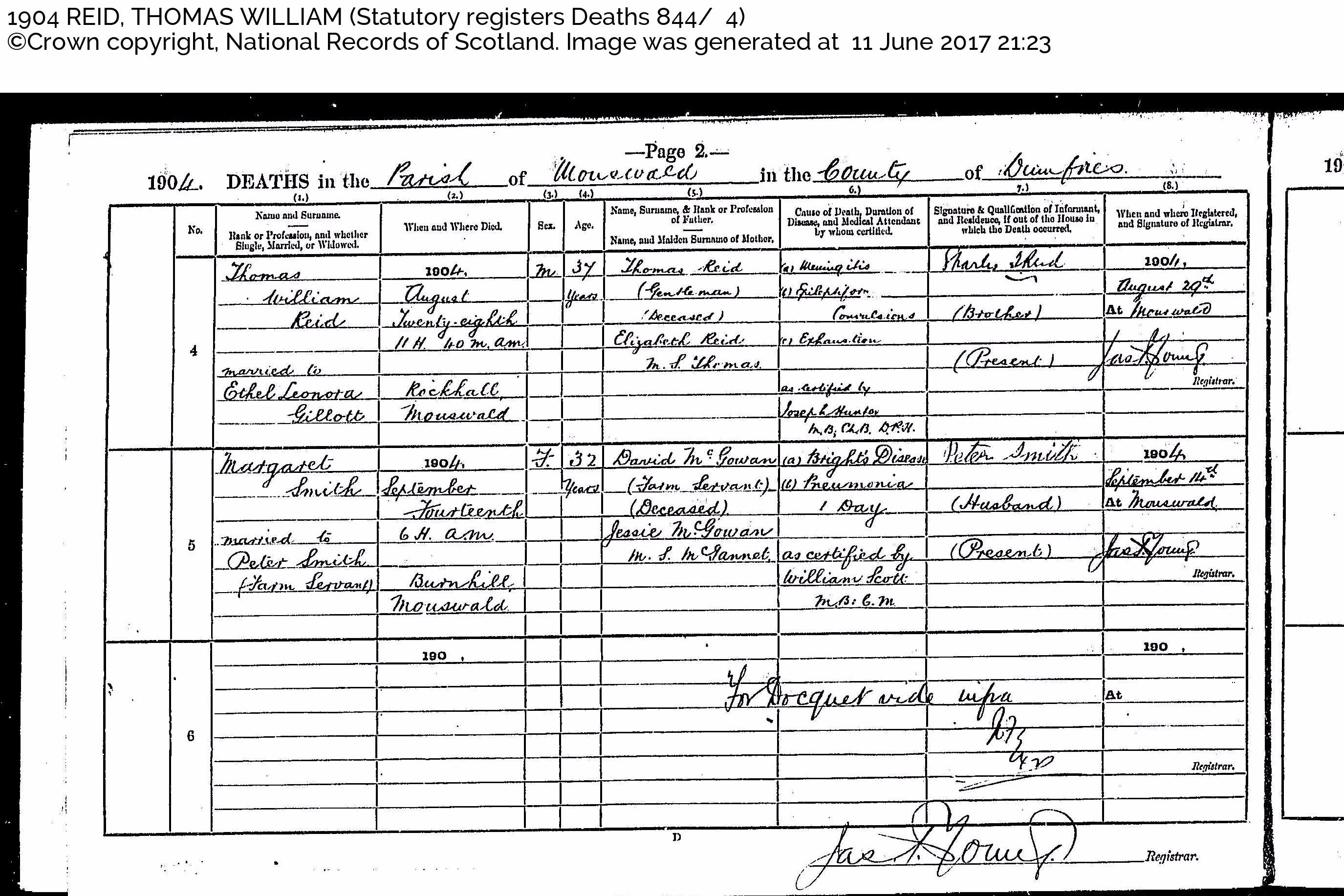 Death certificate of Thomas William Reid in 1904