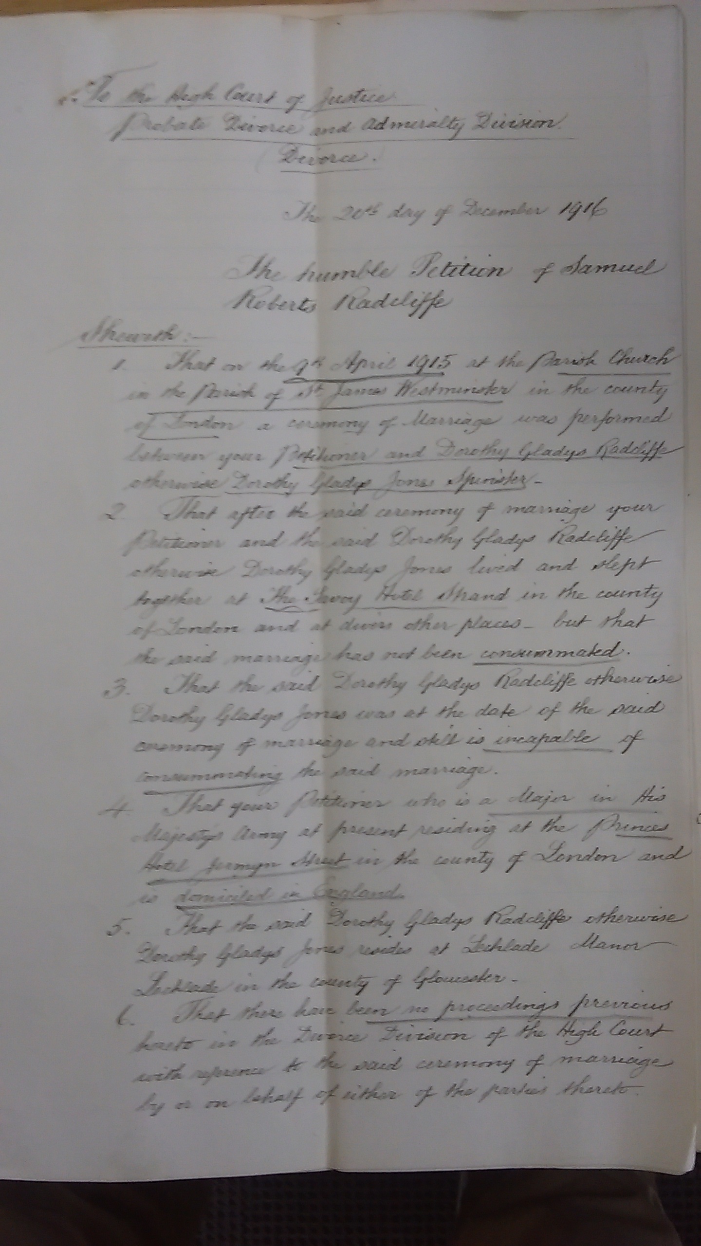 1. That on the 9th of April 1915 at the parish church in the parish of St James Westminster in the county of London a ceremony of marriage was performed between your petitioner and Dorothy Gladys Radcliffe otherwise Dorothy Gladys Jones spinster.