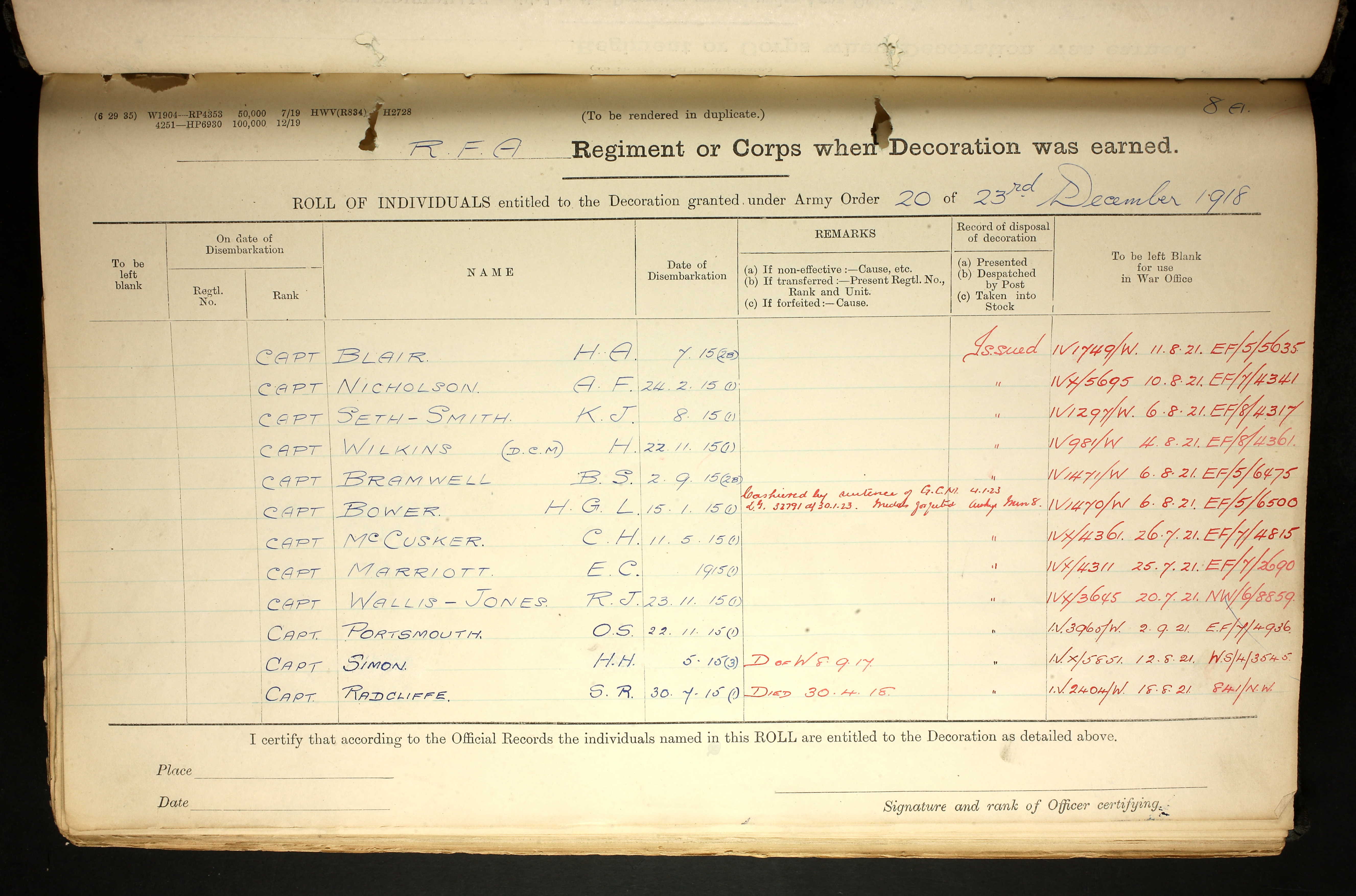 Medal card of Radcliffe, Samuel Robert, Royal Field Artillery, Major