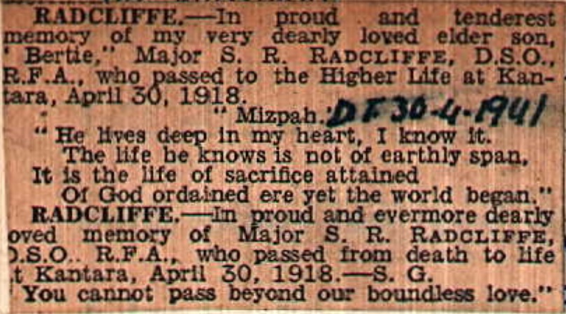 Radcliffe, Samuel Roberts of Four Acres, Hatch Beauchamp near Taunton, died 30 April 1918 at Kantara, Egypt. Probate London. 15 January to Eric George Claydon, solicitor. Effects £24,507 19s 8d.