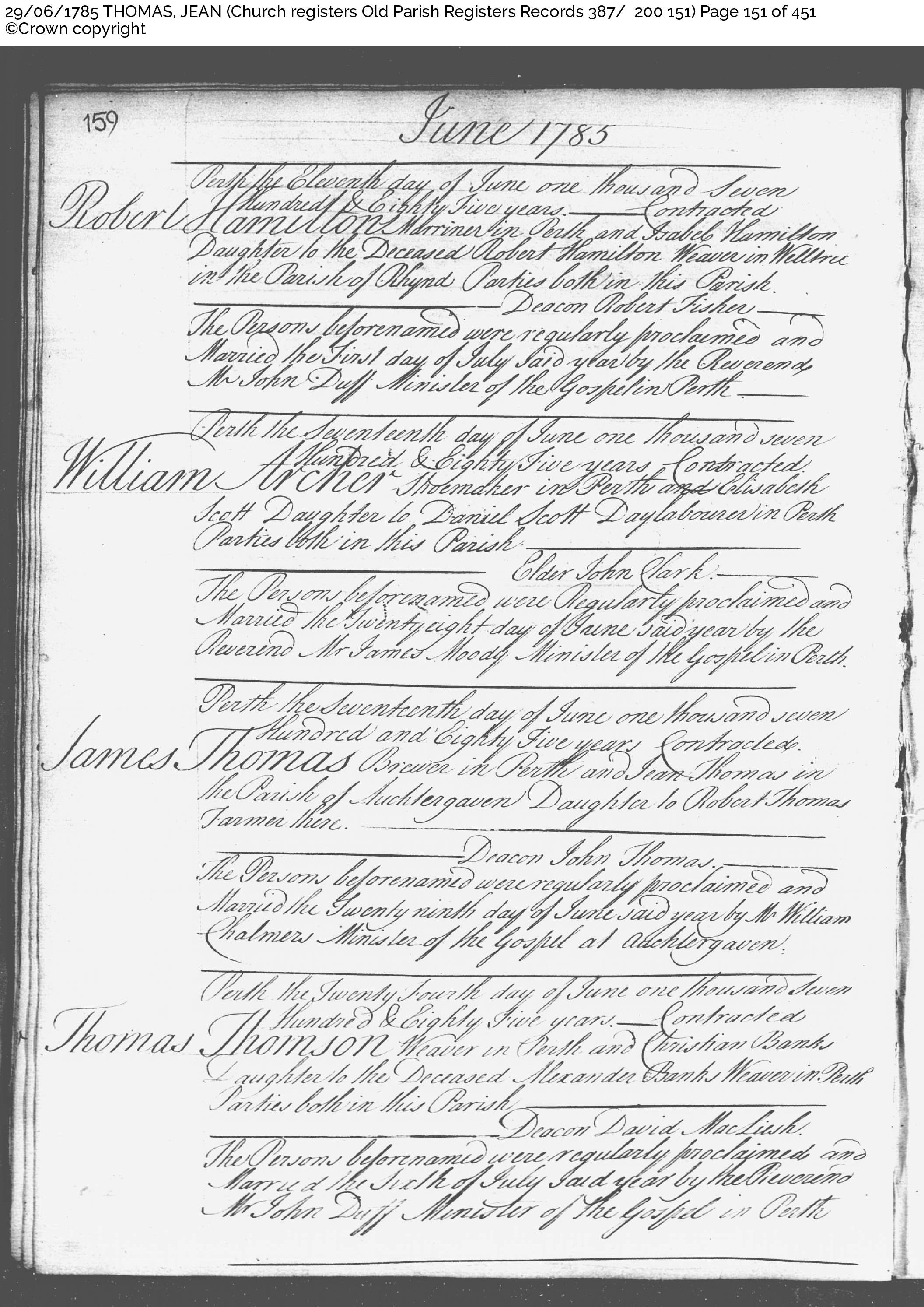 |  James  Thomas Born: 21 APR 1757 Auchtergaven, Perthshire Died: 16 SEP 1823 Perth, Scotland