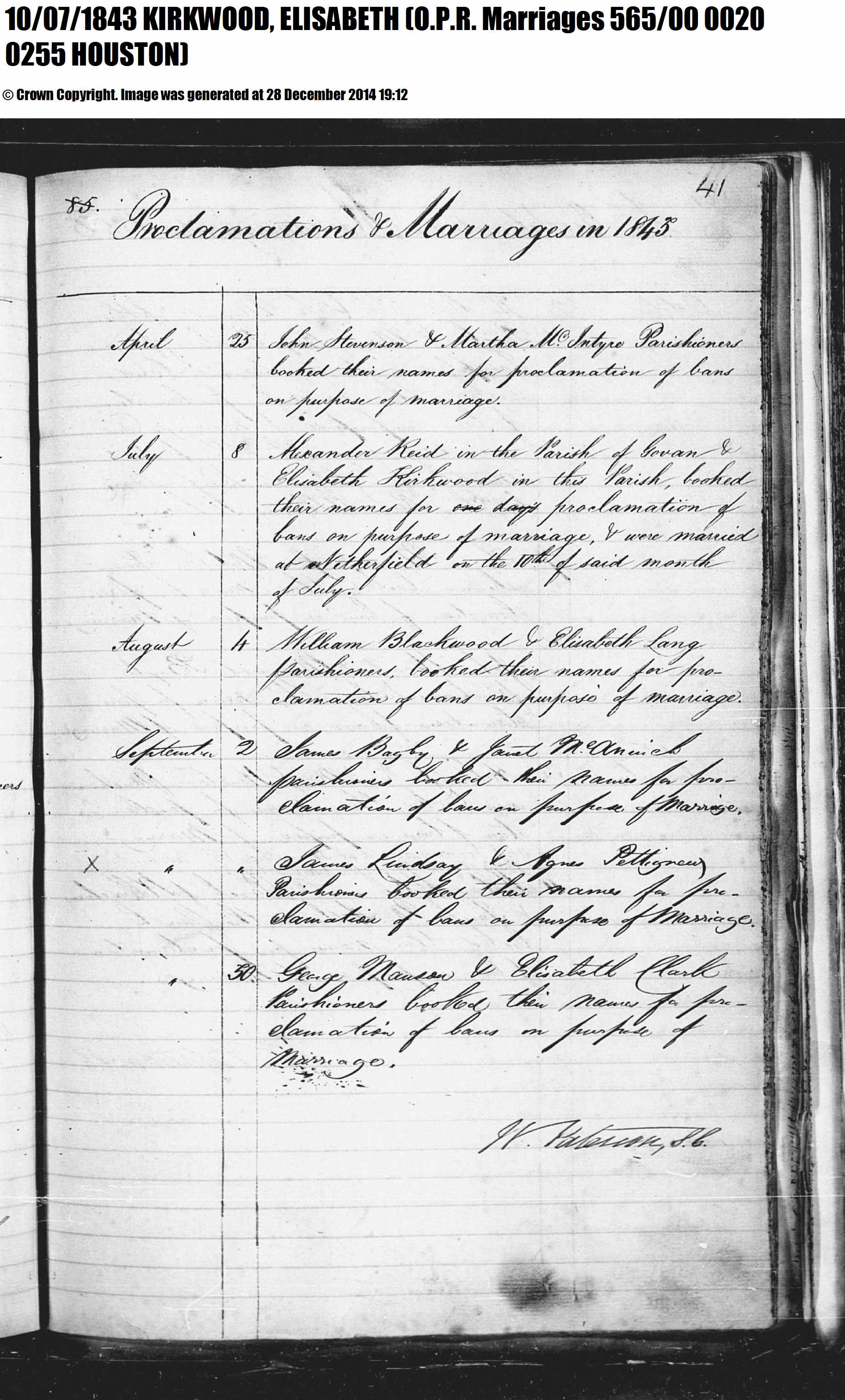 As she was married at Netherfield in Houston, Renfrewshire, the home of John Kirkwood and Elisabeth White, I deduce they are her parents although I cannot find a birth entry for her.