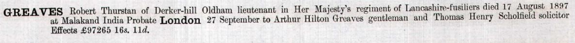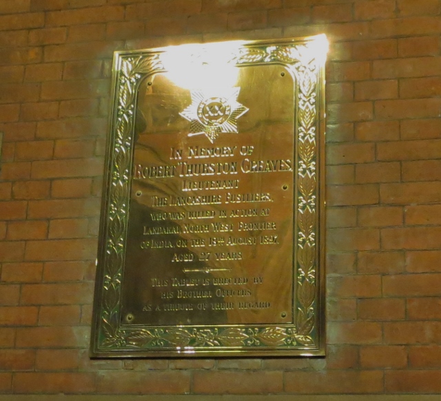 'Sacred to the memory of Robert Thurston Greaves Lieutenant the Lancashire Fusiliers, killed in action at Landakai August 18th 1897, aged 27 years, erected by his brother officers.' (This is the same inscription as at Bury Parish Church).
