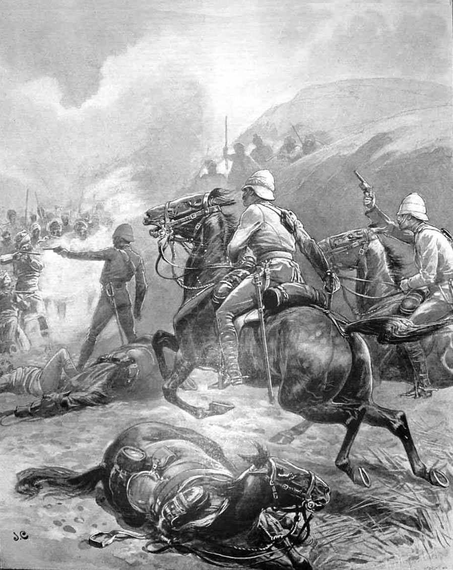 An incident now ensued, which, though it afforded an opportunity for a splendid act of courage, yet involved an unnecessary loss of life, and must be called disastrous. As the cavalry got clear of the broken ground, the leading horsemen saw the tribesmen swiftly running towards the hills, about a mile distant. Carried away by the excitement of the pursuit, and despising the enemy for their slight resistance, they dashed impetuously forward in the hope of catching them before they could reach the hills.