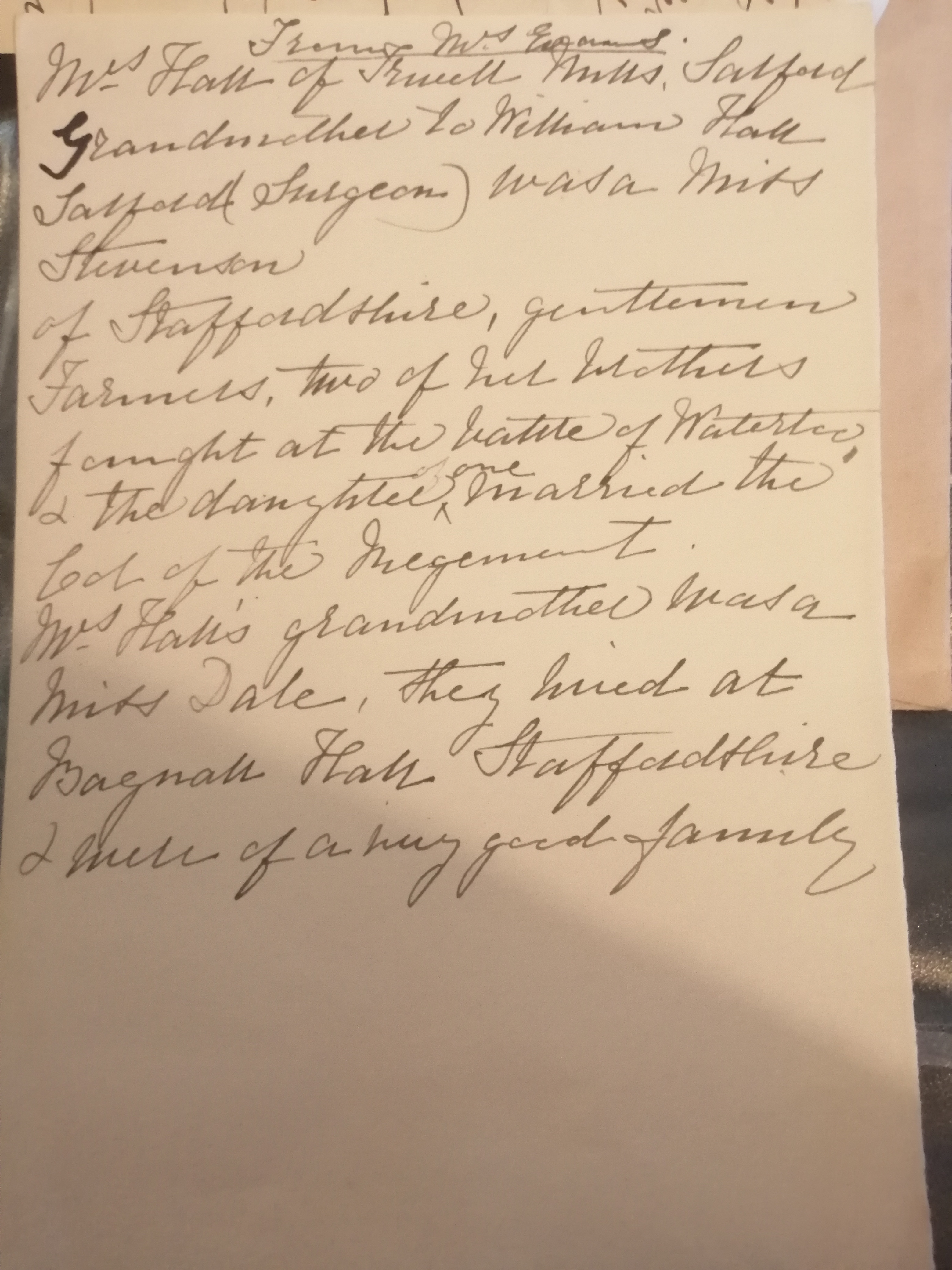 Letter from niece Mrs Evans stating 2 brothers fought in Battle of Waterloo