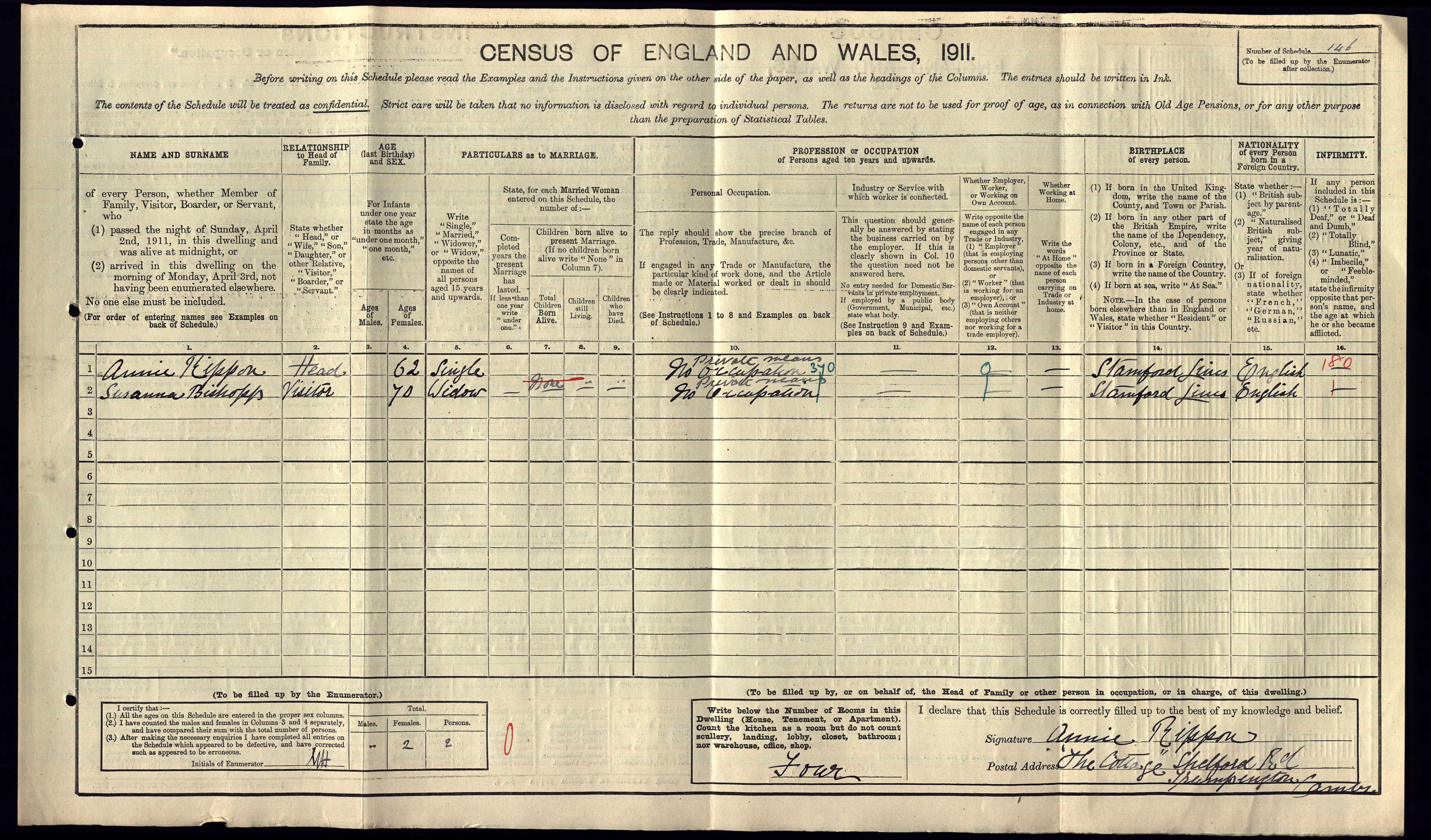In 1911, single aged 62 and living on private means in The Cottage, Shlelford Road, Trumpington, Cambridgeshire