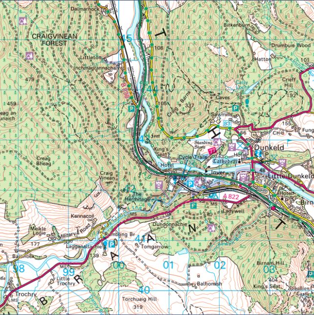 Map showing Dalmarnock, Trochry and Little Dunkeld