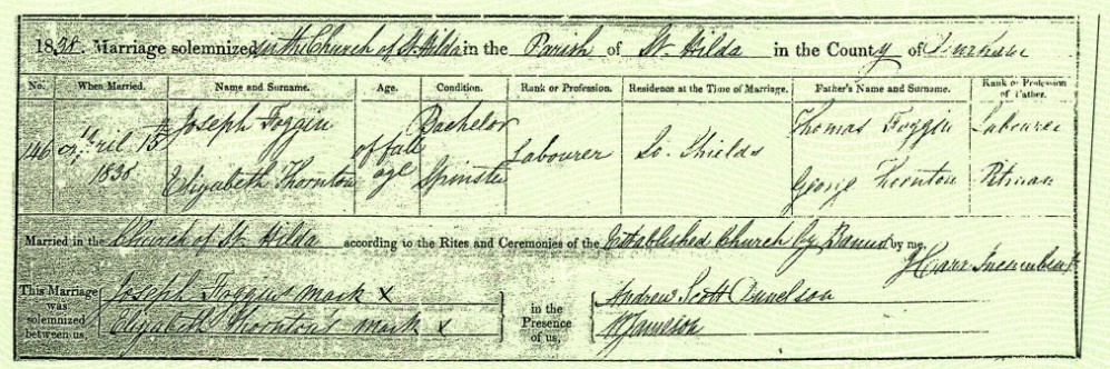 | Thomas Foggon Born: 2 DEC 1785 Sharperton Edge, Rothbury, Northumberland Died: APR 1858 Rothbury, Northumberland, England