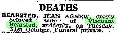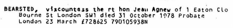 Probate: Bearsted, Viscountess the rt hon Jean Agnew of 1 Eaton Close,