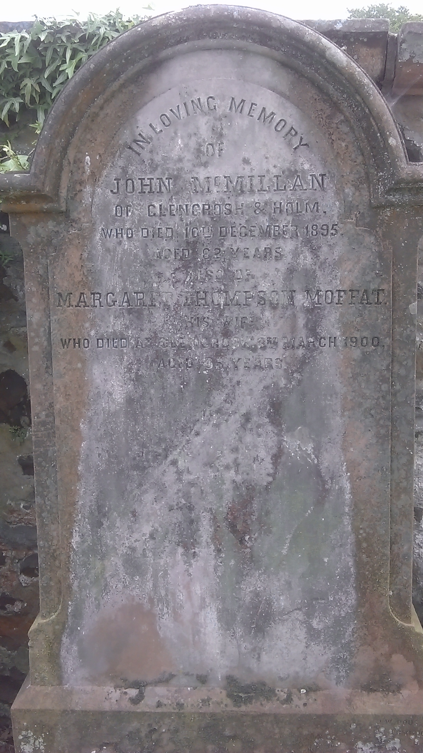 Gravestone of John Macmillan and wife Margaret Thompson Moffat at Carsphairn Parish Church