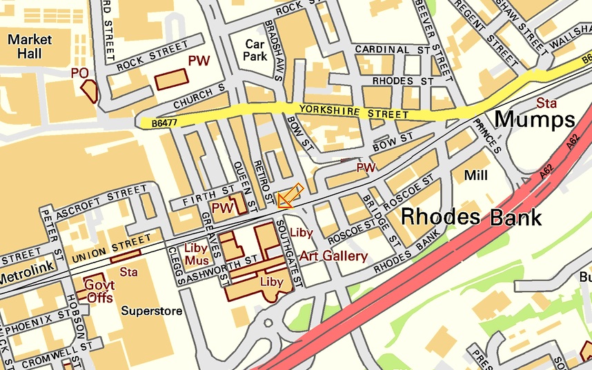 Map showing location of accident crossing Union Street from Retiro Street and being bit by lorry coming from Mumps / Rhodes Bank