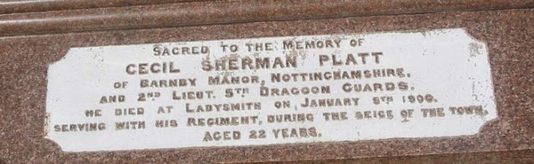 PLATT Cecil Sherman 2nd-lieutenant in H.M. 5th Dragoon-guards died 5 January at Ladysmith Natal Administration London 18 August to Frederick Platt esquire Effects £306 0s 4d.