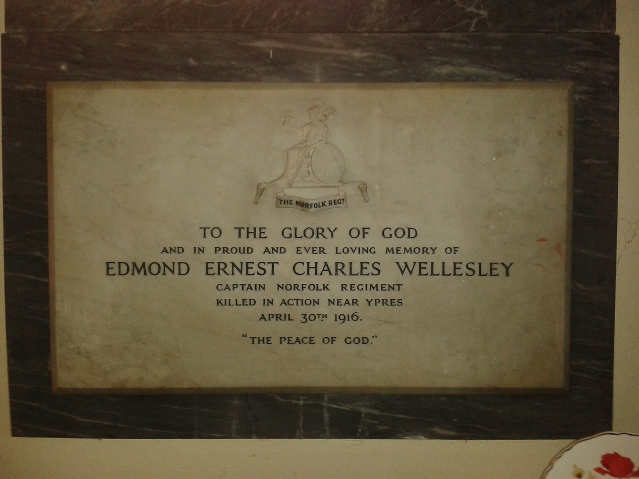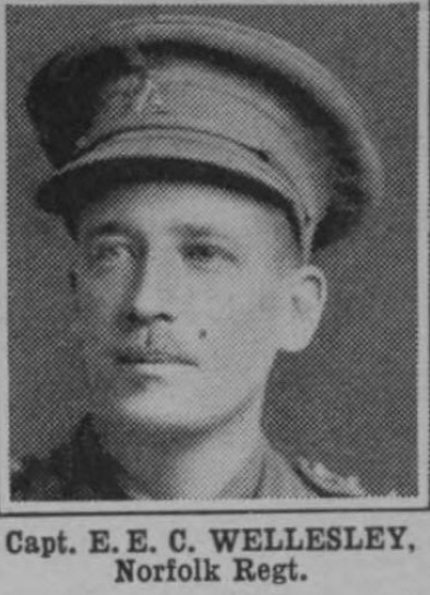 Wellesley, Edmond Ernest Charles of Bramley Grange near Guildford captain 9th Norfolk regiment died 30 April 1916 in France. Administration (with Will) London 26 July to Gwendolyn Wellesley widow. Effects £221 17s. 6d.