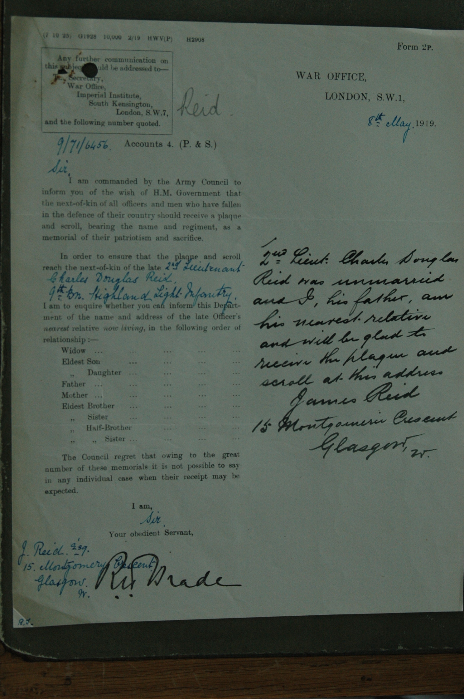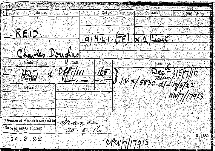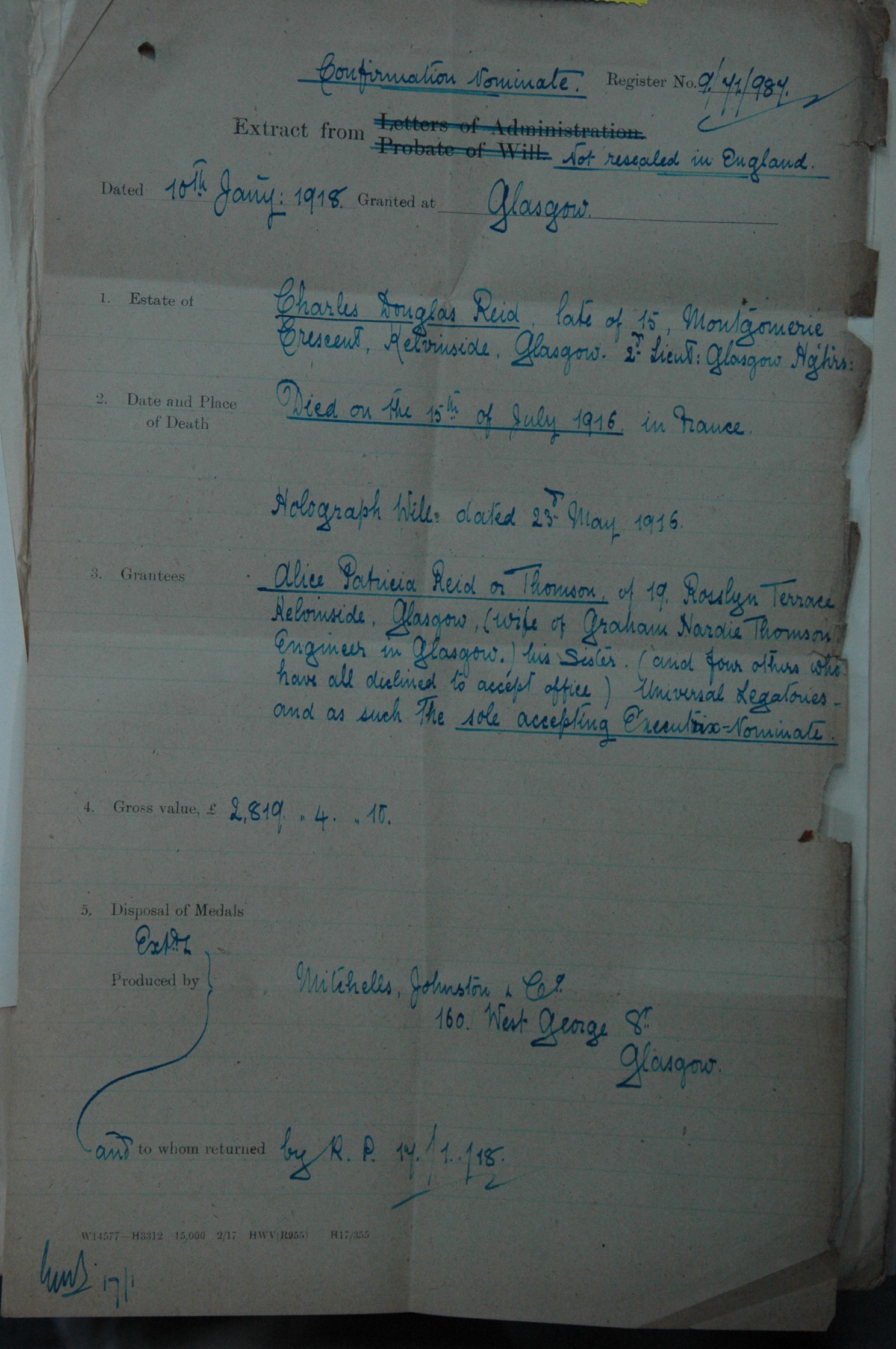 Charles Douglas Reid lived at 15 Montgomerie Crescent (now Clevedon Crescent), Glasgow with his parents, James and Patricia Margaret Reid, the youngest of 5 children.