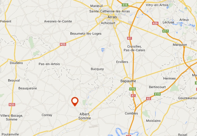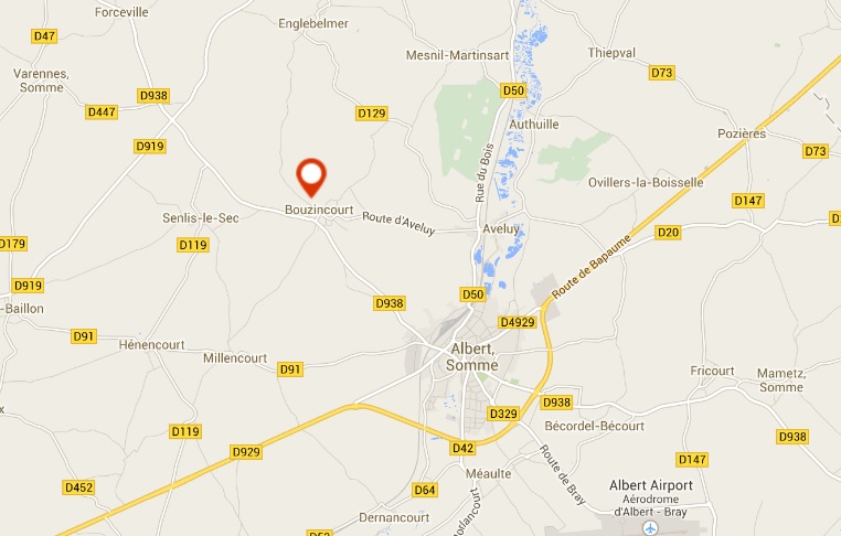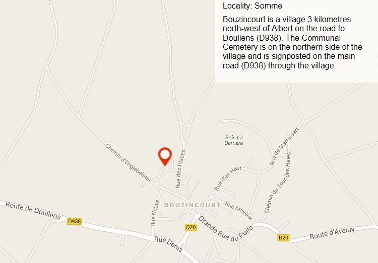 Bouzincourt is a village 3 kilometres north-west of Albert on the road to Doullens (D938). The Communal Cemetery is on the northern side of the village and is signposted on the main road (D938) through the village