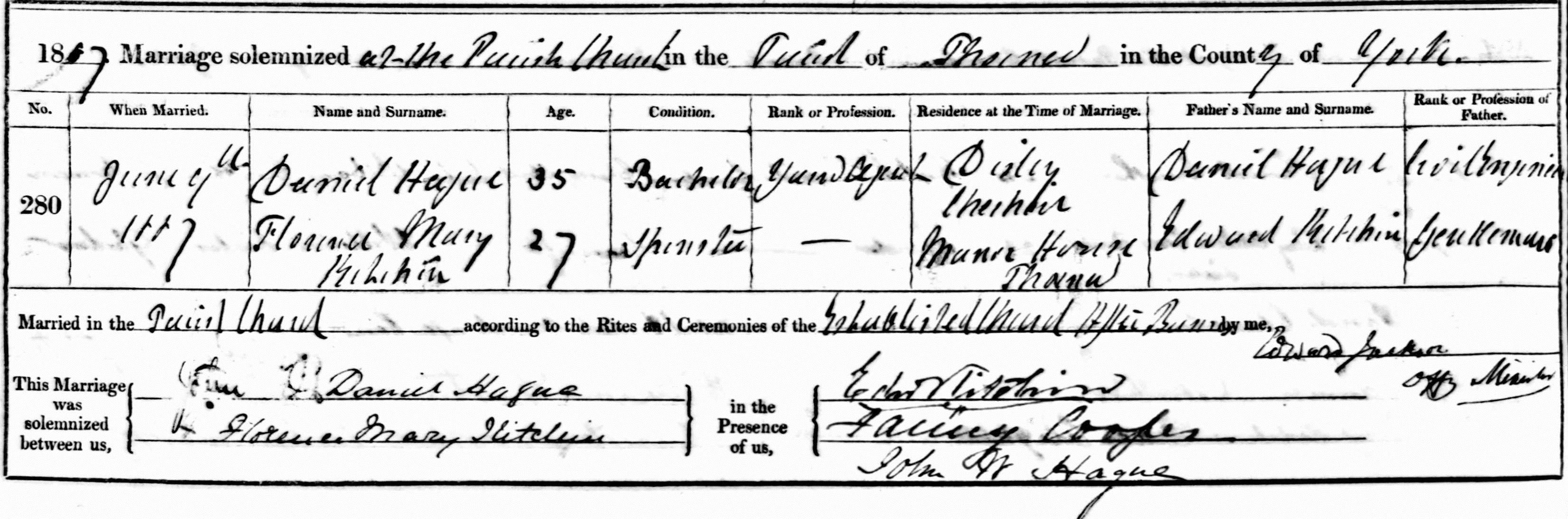 Marriage certificate of Daniel Hague and Florence Kitchin