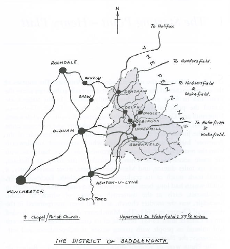 Saddleworth lies on the western side of the Pennines. The courses of the upper reaches of the River Tame and its early tributaries score the moorland to form an exceedingly hilly district. In the valleys are dotted the principal villages: Denshaw, Delph, Diggle, Dobcross, Uppermill and Greenfield. In the mid-eighteenth century Saddleworth was a part of the former West Riding of Yorkshire and perforce, came under the jurisdiction of remote Wakefield on the other side of the Pennines’ highest and bleakest hills which separated Saddleworth front the rest of Riding. Its ready intercourse, therefore, had to be with the more accessible Lancashire, particularly the town of Oldham, some six miles distant, and Manchester where, more conveniently, it could trade much of its traditional woollen cloth. Ecclesiastically, Saddleworth had long been tied westwards: a chapel had been built in the district, early in the thirteenth century, of which St Chad, Rochdale, was the mother church, and had been incorporated in the diocese of Chester in 1541 (The Manchester diocese was not divided out of Chester until 1848. Because of its circumstances Saddleworth had imbued its people with strong senses of independence and self sufficiency; the Platts were of these people.