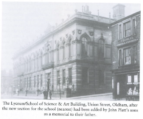 However, the principal establishment in Oldham concerned with the betterment of education was the Lyceum. To the furtherance of this establishment both John and James Platt made notable contributions. The Lyceum had been founded, in 1840, as a mutual improvement society for working men. At first, meetings were held in premises in Henshaw Street but shortly afterwards a move was made to Queen Street where a library, newsroom and reading room were installed. In 1854 James Platt, who by then had been elected President of the Lyceum, resolved a superior building was required and he planned and organised, in the Working Men’s Hall, an exhibition, of scientific, historical and cultural items, loaned from all over the country, to raise funds for such a building.