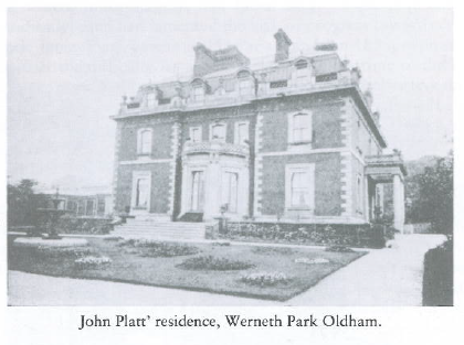 In the eighteen-forties, those industrialists who could afford to do so were moving to a place of residence away from the immediate vicinity of their factories. John Platt certainly could afford, as could Samuel Radcliffe — his father-in law, Josiah Radcliffe and Eli Lees — a cotton spinner and weaver and brother of Asa Lees. In partnership, in 1847, they acquired an area of land in Werneth which had been the estate and site of the ancient manor house of the Oldhams of Oldham. This Land they laid out as Werneth Park in which each built a new mansion, the most superior, perhaps, Oldham was ever to see within its boundaries. John and Alice Platt had thirteen children, seven sons and six daughters. By 1851, five of the children had been born, the eldest, Henry, being eight years old and, together with a governess and four servants they were established at the mansion. Ten years later, although the older boys were now away at school, the family and the household comprised John and Alice Platt, seven of their children and fourteen servants. The eldest daughter, Mary, now a young lady of seventeen, divided the two oldest boys: Henry and Samuel. At first, John Platt had strong intentions that his sons were to receive a useful and practical education, whereupon, the two oldest boys were sent to Cheltenham College, where the curriculum was directed towards imparting modern commercial knowledge; the classics were not studied. From thence they proceeded to the Friedrich Wilhelm Real Schule in Berlin. On return to England, Henry went up to St. John’s College, Cambridge, whereas Samuel went directly into the works at Oldham. Thereafter, John Platt seems to have changed his ideas, the third son went to Harrow and the other sons, too, were to follow a conventional English education commensurate with the status the family had now achieved. James Platt and his wife, Lucy Mary (nee Schofield) took up residence at Hartford House, on the nearby corner of Grange Avenue and Wellington Road: they had one child, a daughter, Edith.
