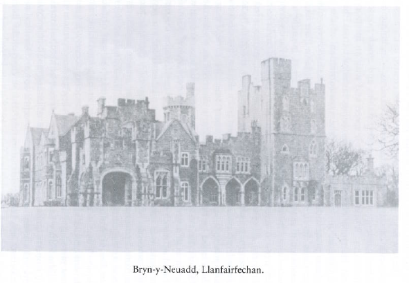 It has been said the Llanfairfechan that came into being in the mid- nineteenth century was a product of the Industrial Revolution, though patently not in the usual sense, but certainly John Platt’s presence in the place brought a degree of prosperity and opportunities far beyond most of the inhabitants’ previous understanding. Besides those people who raised capital from the sales they made to John Platt many more benefited from the considerable and varied forms of employment he generated, stonemasons, in particular, had never imagined such a scale of building as John Plan set in train. A few Llanfairfechan men moved to Oldham to take up employment in Platt Brothers’ works, a move occasionally to recur throughout the time the Platts had their estates in North Wales (John — “Johnnie” — Hughes, the redoubtable Works Director of the nineteen thirties, hailed from the neighbouring village of Abergwyngregyn, he was the son of Colonel Henry Platt’s head coachman). In the earlier years, several young women also made the move into Service at Werneth Park. Certain of those local people who had raised capital used it to finance more new boarding houses and shops two of which, in tribute to the “great man”, as they referred to John Platt, were given the names “Manchester House” and “Oldham House”. John Platt’s own riches were taken to be infinite, even as late as the nineteen-thirties some very old people in Llanfairfechan, most of whom were only Welsh speaking, used, graphically and sincerely, to recount: “to the station, trains with the gold of Mr John Platt were coming”. Then, just when it seemed the boundaries of John Platt’s new country estate had been drawn he, at a stroke, more than doubled his Welsh landholdings when he bought the estate which bordered on Bryn-y-Neuadd. This estate was Gorddinog of which only a part lay in Llanfairfechan, the rest was in Abergwyngregyn, commonly known, for short, as Aber. Immediately, the original House was razed and a superior one erected in its place. In 1869, Henry Platt, who, it has been seen, was John Plan’s eldest son, with his recent bride, Eleanor, took up residence in the newly completed mansion at Gorddinog.