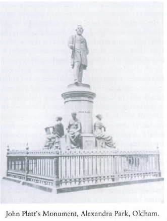 The townspeople of Oldham received the news in the vein of a family bereavement. Obituaries were generous with their words in recalling to memory the widespread benefits John Platt had brought to the town through his company and by way of the energetic and unfailing public services he had rendered. Alice Platt was presented, on 29 May 1872, with an illuminated letter of condolence, arranged in book form, from the Mayor, Alderman and Burgesses of the Borough of Oldham. John Platt was buried in a surprisingly modest tomb in Chadderton cemetery. The tomb bears the simple inscription: “Beneath this tomb lie buried the remains of John Platt, MP for Oldham, died Paris 18 May 1872, aged 54, Requiescat in Pace”. Six years after his death a bronze statue, mounted on an imposing marble plinth, was erected in his memory, close to the front of Oldham Town Hall, which, in later years, a less remembering generation chose to relegate to Alexandra Park. Yet, many of the torches he lit for the benefit of Oldham, especially in the field of technical education, were to be kept aflame by others he had inspired and by the great Company he had owned. The death of John Platt posed no serious difficulties at the Company for Samuel Radcliffe Platt, who had been well and truly schooled by his father, instantly took the helm, though far earlier than he had expected to he called to do.