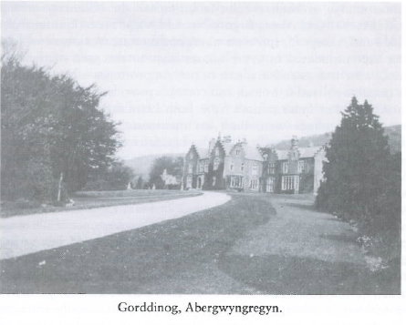 The Gorddinog estate which John Platt had bought, like Byrn-y-Neuadd, was in a state of some neglect. It had been the ancestral home of a long-standing Welsh family which had died out. In the interim, a Mrs Crawley had occupied the House before she married the Rector of Llanfairfechan, Mr Vincent, who, later, was to become the Dean of Bangor. John Platt had regarded the House to be antiquated and had decided it had to be demolished and replaced with a befitting new mansion. The new mansion was built entirely from local granite with an air of the Elizabethan style of architecture. It had been realised, if the new mansion was positioned further up the natural slope of the ground, than where the original house had stood, the area then made available, in front of the new mansion, could be landscaped. However, to do this required the course of a small river (Nant y Felin fach) to be diverted from a point behind the intended site for the new mansion. Additionally, John Platt had decided that if the diversion of this river was continued all the way to the sea, a distance of almost three quarters of a mile, such that it passed through the western end of Bryn-y-Neuadd Park, the Park would be enhanced. A granite lined open culvert was constructed (on a line to the east of the river’s natural course) which ran through Gorddinog land until it reached the Turnpike road, thence under the road into Bryn-y-Neuadd Park, close to Grand Lodge, where natural looking ponds were made in its course. The acreage of the Gorddinog estate was far greater than the acreage on which John Plait had developed the Bryn-y-Neuadd estate, respectively some 1100 to 330. Not only did Gorddinog contain more pasture and arable land but it had a large expanse of hill land over which a substantial flock of the native Welsh sheep could be run. The lower hillsides, directly behind the House, were planted as woodland in which was included a cluster of exotic trees from overseas, as was the then fashion, and masses of rhododendrons, in a variety of colours, which in the spring and early summer formed a breath-taking backdrop to the House. In every respect, Gorddinog was a superior estate to Bryn-y-Neuadd.