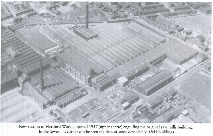 Meanwhile, because the volume at which the post war orders had been running was slackening and the business which had been expected to arise from the Cripps Plan (a government scheme to re-equip the Lancashire cotton industry) had not materialised questions were asked in Parliament why this was so) TMM was forced to bring about some retrenchment of its manufacturing capacity. In 1951 the Soho Works of Asa Lees was closed down and its operations absorbed into Hartford Works. Arising from this move, the headquarters of TMM had to be transferred to Hartford Works as well. Just before Christmas 1952, Platt Brothers’ East Works was closed and its operations, too, were absorbed in Hartford Works. So ended the original Hartford Works at Greenacres moor.