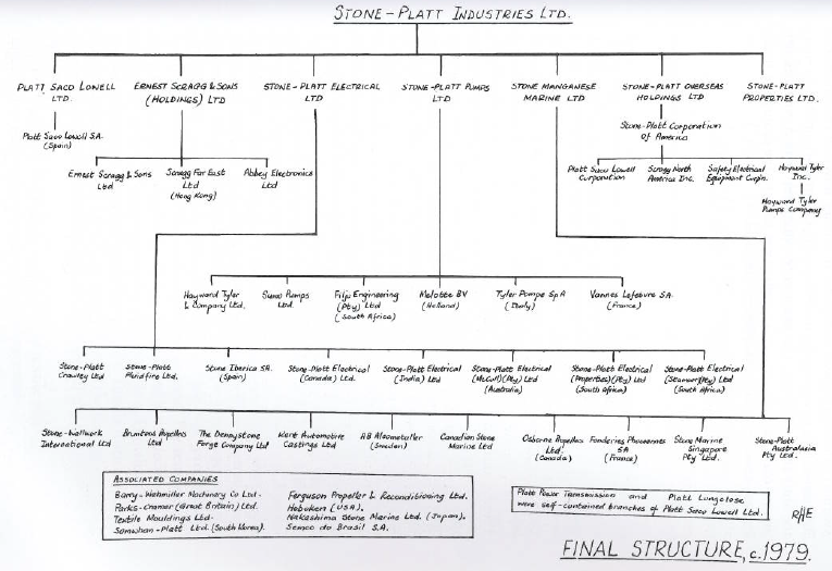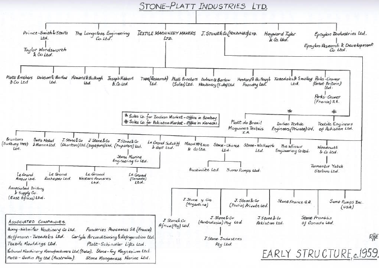 In 1957 the financial structure of Platt Brothers & Company (Holdings) Limited was changed. Through a re-organisation of the shares the Capital of the Company was increased from £4 000 000 to £7 250 000, in the course of which exercise the last of the shares, held by minority interests, in TMM, Tweedales & Smalley and Prince Smith and Stella were acquired, making all three companies wholly owned subsidiaries. Shortly afterwards, to rationalise the cotton machinery interests, the Tweedales & Smalley shares were transferred to TMM. Kenneth Preston who had been the Chairman of J Stone & Company from 1943, had, in 1946, succeeded his father, Sir Walter Preston, as the Chairman of Platt Brothers & Company (Holdings) Limited. Although the two companies were financially independent they had, through the person of Kenneth Preston, worked closely in matters of mutual interest, particularly as each company was a large exporter of its products. Moreover, each company had embarked on a programme of diversification and so, in 1958, it was decided to bring the two companies under common ownership and control. The move was effected by Platt Brothers & Company (Holdings) Limited increasing its capital to £11 500 000 to absorb, by way of share allotment and some cash payment, J Stone & Company (Holdings) limited — the name the Stone company had assumed in 1951 following a re-organisation or its structure to mark the move Platt Brothers & Company (Holdings) Limited changed its name to Stone-Platt Industries Limited which was the final name the business created by Henry Platt in 1815 was to bear — except for the substitution of ‘plc’ for ‘limited’ when the law changed. To some people in Oldham, the name ‘Stone-Platt Industries Limited’ was, at first, confusing since they believed a company of that name had been extant from the years of the second world war. In reality, the name ‘Stone-Platt Limited’ had been allocated to a ‘shell’ company in which, the then still Independent, Platt Brothers and Stone were joined to execute a particular form of war work carried out in the, Stone owned, Wallwork company’s works in Oldham. Once the work had been completed the shell company was dissolved.
